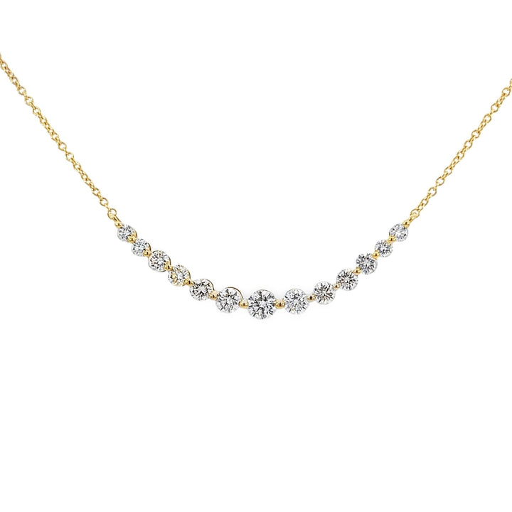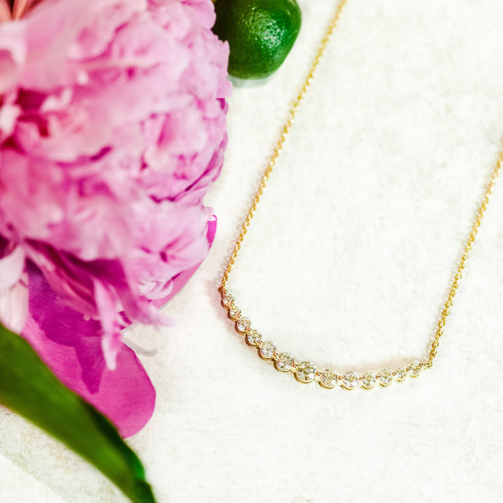 The "Smile" Necklace is a joyful expression of elegance, featuring 13 round diamonds set in a delicate upward curve, reminiscent of a radiant smile. Its subtle sparkle adds a touch of happiness to any look, making it perfect for bridal wear or as a meaningful everyday piece. The necklace’s graceful design captures the essence of both modern simplicity and timeless beauty, offering a sparkling reminder of life’s joyful moments.