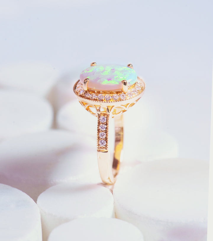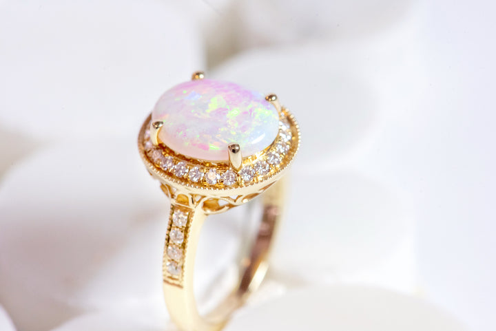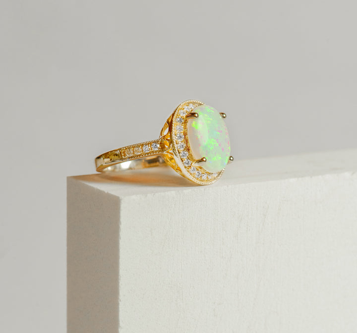 Unleash your inner goddess with the "Soleil" Ring. The mesmerizing white ethiopian opal is the star of this show, surrounded by a sparkling diamond halo and delicate milgrain details. Every glance will reveal new depths of color, from verdant greens to ocean blues to fiery reds. A timeless and luxurious piece that will ignite your imagination.