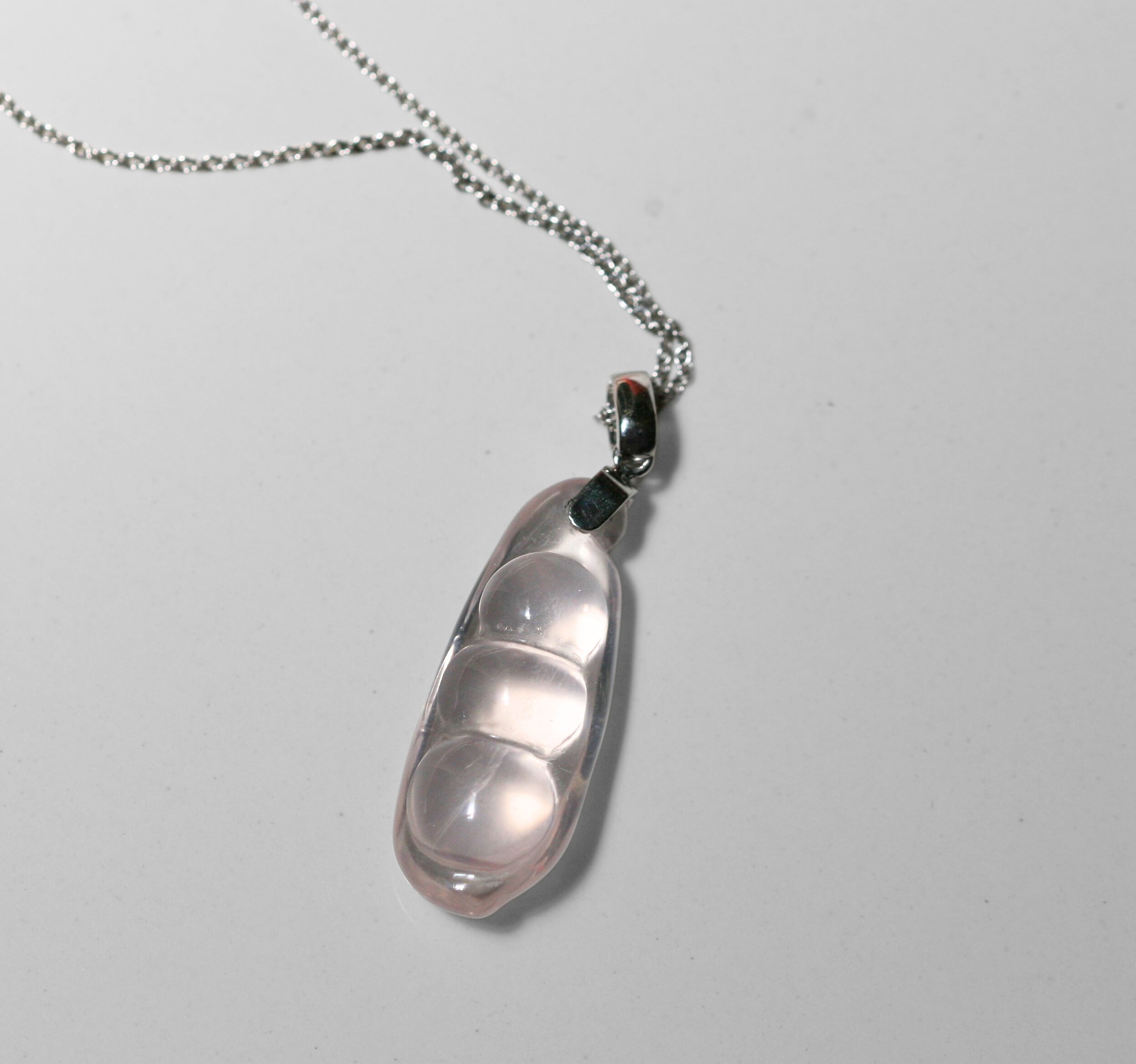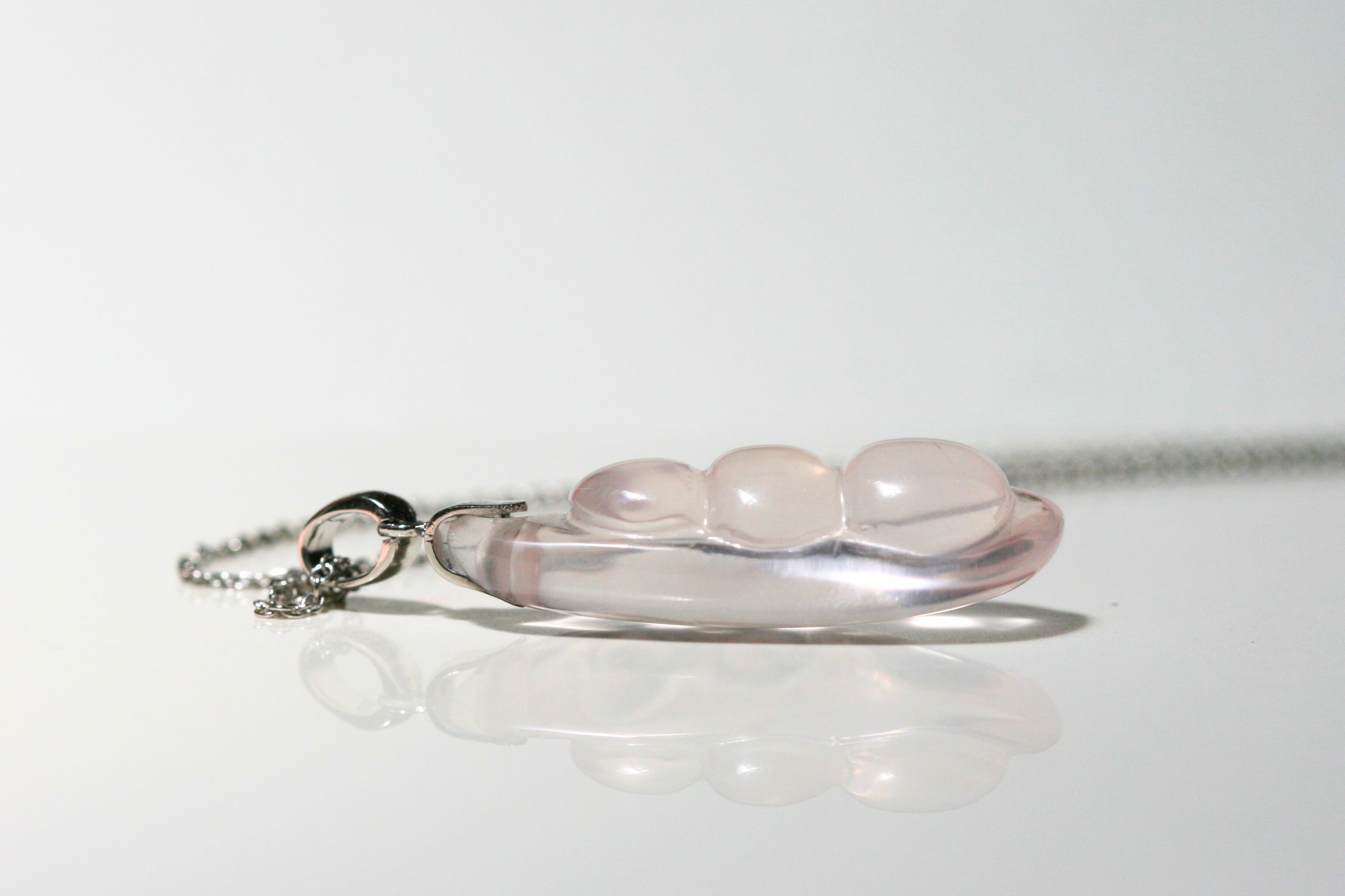 Indulge in the elegance and charm of our "Sweetpea" pendant crafted with 22 carats of rose quartz. Shaped into a delicate pea pod, it makes a wonderful gift for mothers, sisters, or any beloved family member. Our "Sweetpea" pendant glows in the light! Complete the look with a complementary chain, sold separately.
