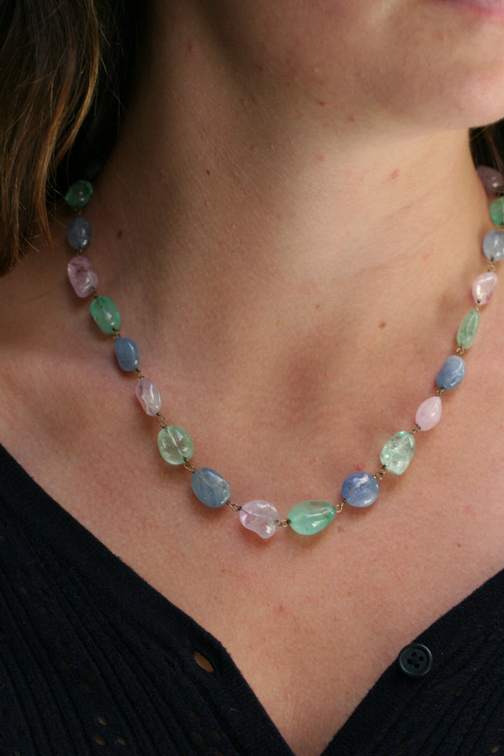 Indulge in luxury with our "Tamara" Necklace. Adorned with over 50 carats of tumbled rubies and 150 carats of tumbled sapphires, this statement piece will elevate any outfit. Each unique stone boasts natural inclusions, adding to the beauty of this sophisticated and exclusive necklace. The smooth stones lay comfortably on the chest, with a luxurious weight. As the sun hits this necklace, each stone glows from within.