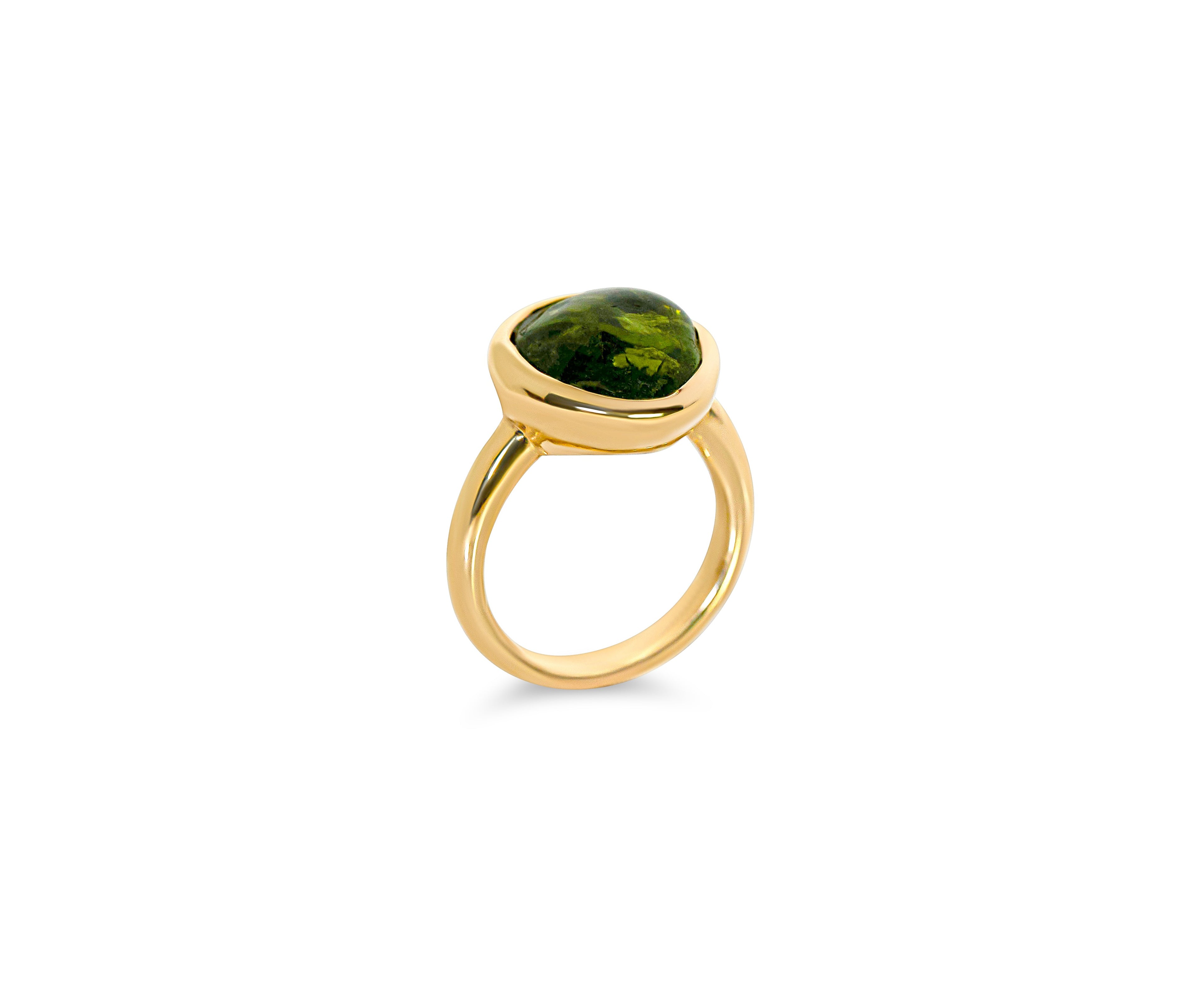 The Willow Ring is a harmonious blend of organic beauty and timeless design. At its center is an 11.60-carat cabochon peridot, celebrated for its vibrant green hue and unique, natural inclusions that give the stone character and individuality. Bezel-set in 18k yellow gold, the peridot is framed in warmth and elegance, allowing its clarity and richness to shine. The comfort-fit gold band provides both style and comfort, making this ring a statement of effortless sophistication. A one-of-a-kind piece, the Willow Ring captures the essence of natural beauty with a touch of modern charm.