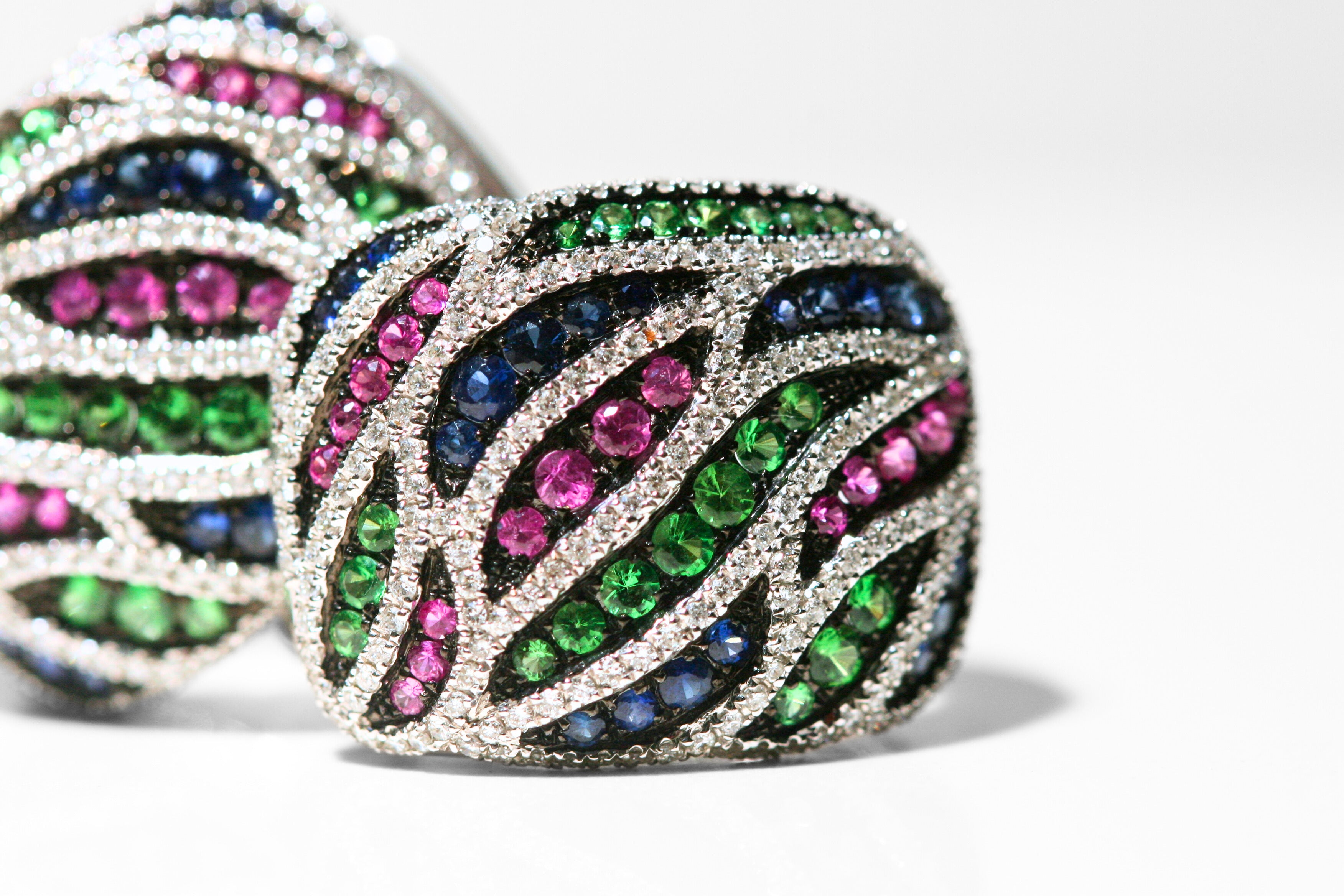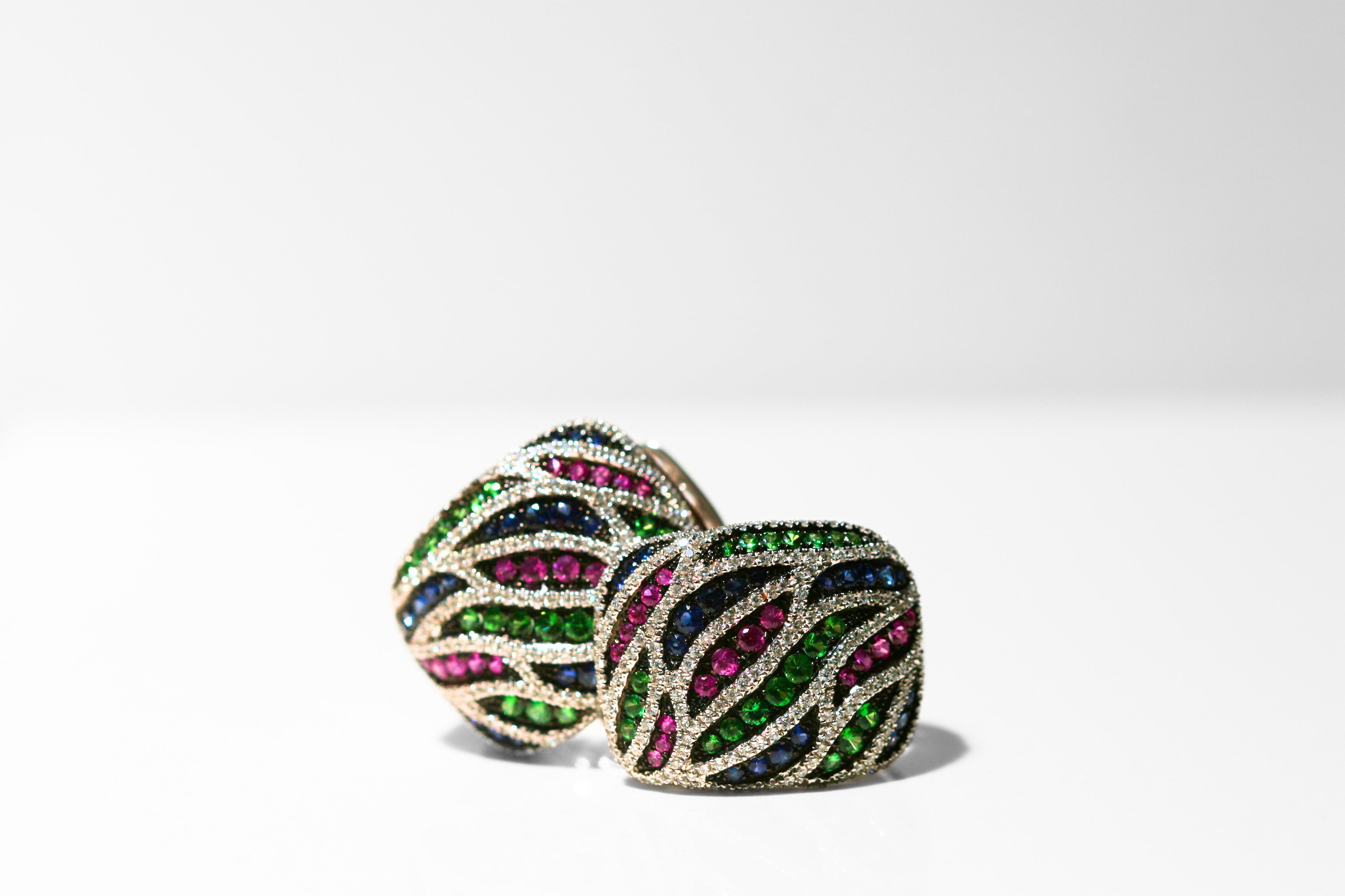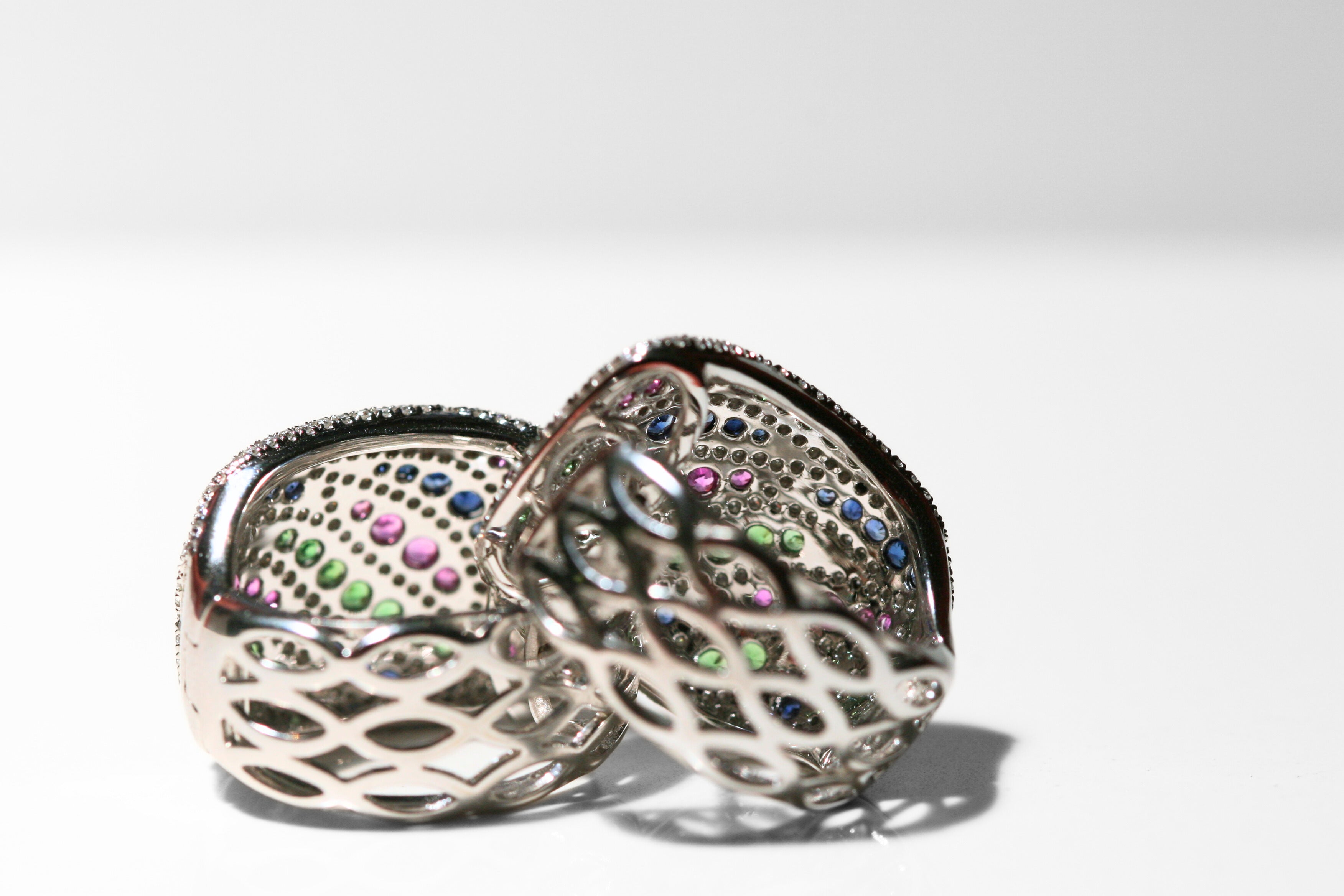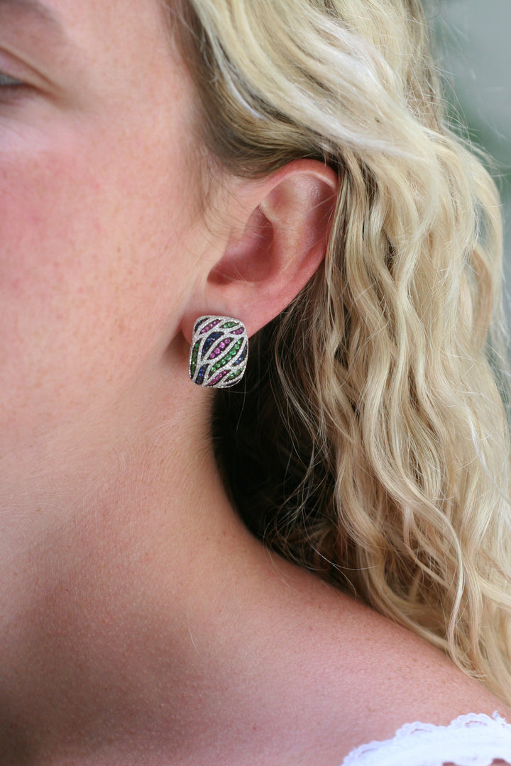Indulge in luxury with our "Zinnia" earrings. Crafted in 18k white gold, these stunning statement earrings feature a dazzling display of blue and pink sapphires, tsavorite garnets, and diamonds. The colorful stones make waves through a sea of sparkling diamonds, while the secure fit ensures all-day comfort. Elevate any outfit with these elegant and exclusive earrings.
